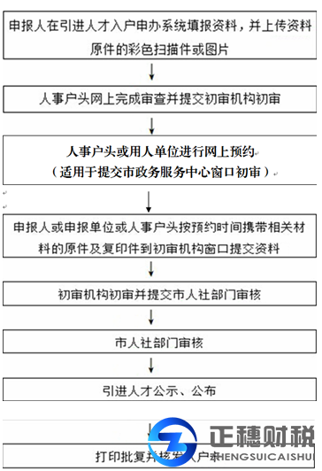 (區屬單位)網上填報資料→各區人才服務管理辦公室受理并初審→區人社局審核→網上公示→公示無異議打印批復→核發廣州市入戶人員信息卡。